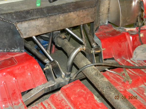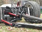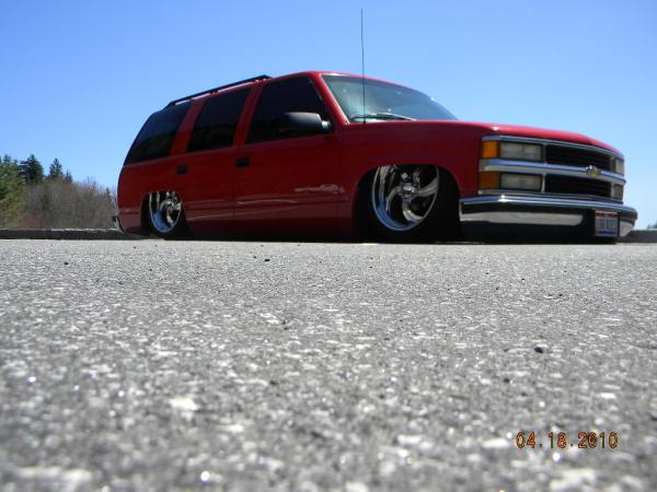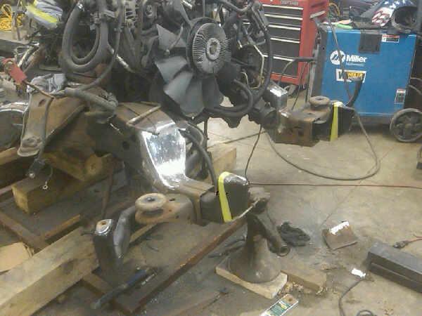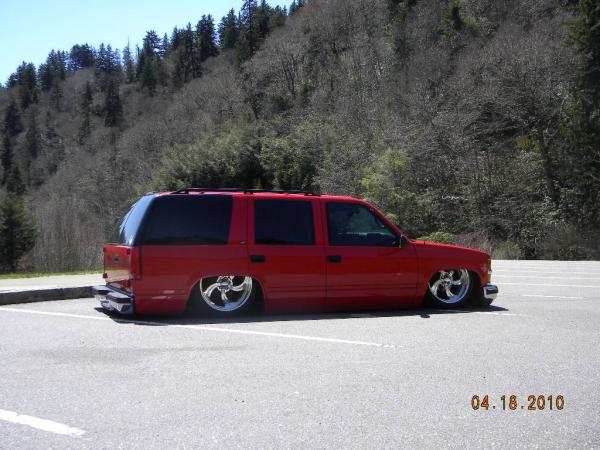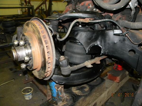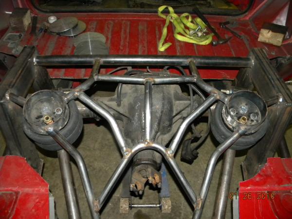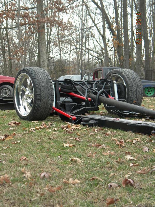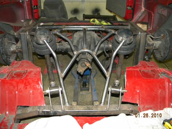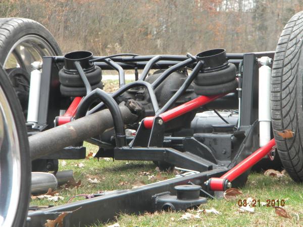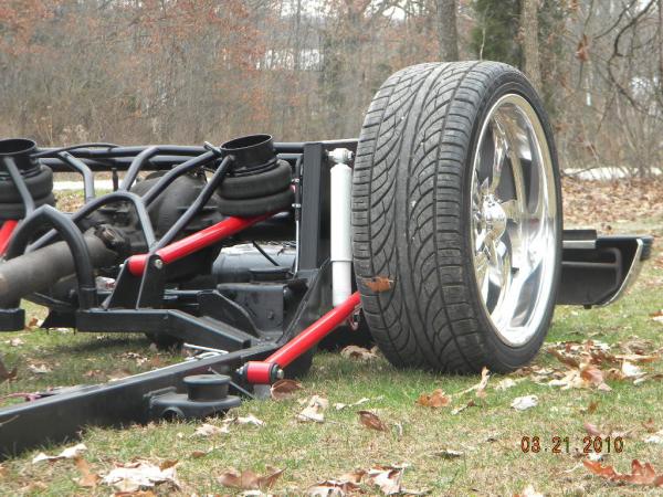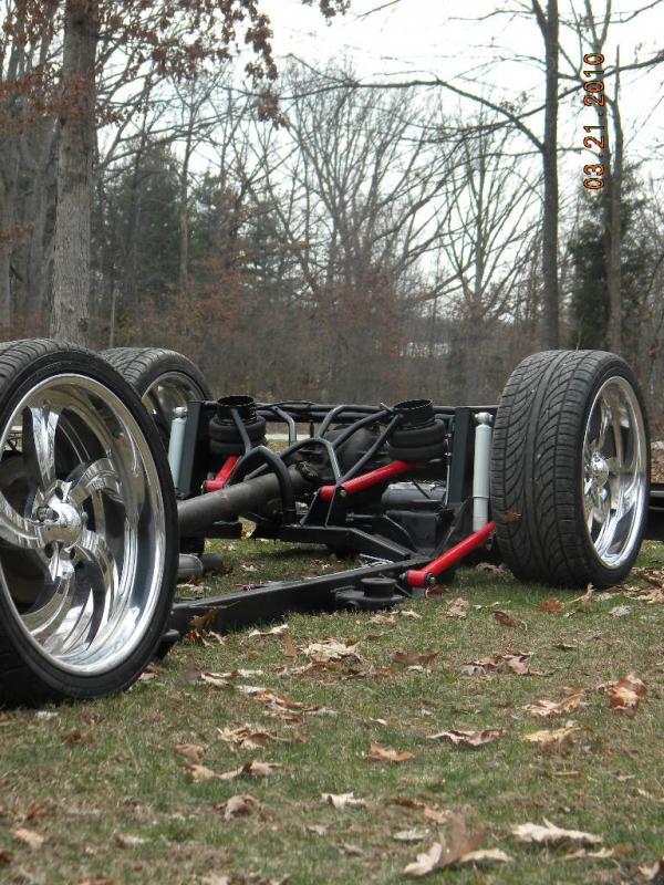 Front: Pie cut upper control arms, dehumped lower arms, drop spindles, frame notched for tie rods, tubbed firewall, Airlift 2600s