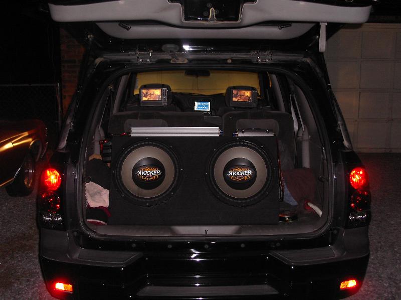 kenwood 7in touchscreen CD/DVD/Mp3, Ps2 in the glove box, kenwood mids and highs, planet audio 200w for mids and highs,2500w for subs,2 kicker CVR 15s,Batcap,7in headrest screens