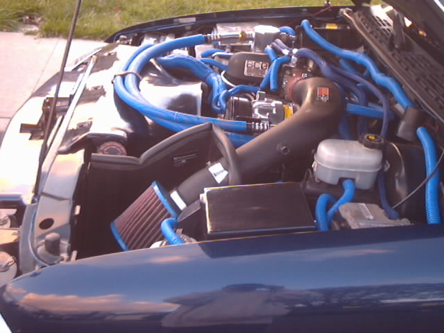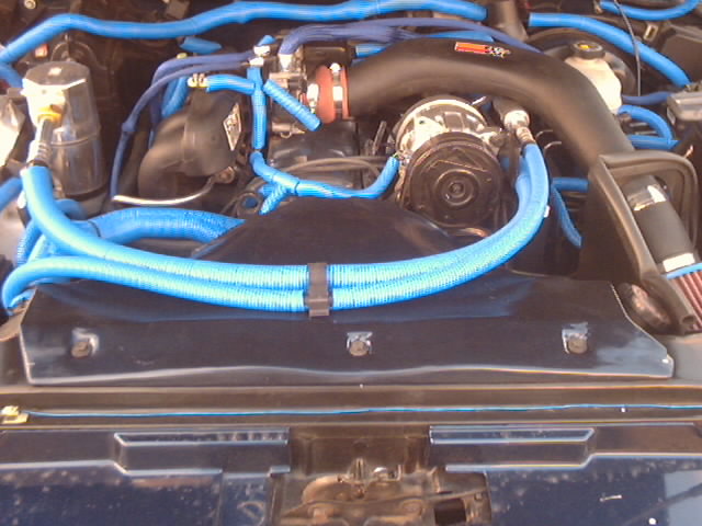 Blue Wire looms Custome molded fiber glass fan shroud and relay box cover, painted to match, Custom Polished aluminum ECU cover. Blue neons and blue hot wires