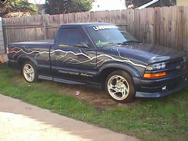 APC sport mirrors, Steel Cowl induction hood. shaved tailgate handled. Molded roll pan, Duel exhaust ported out the roll pan. Clear corners. Crystal series head lights from APC. Clear euro tail lights from APC, 3 sets of strobes in headlights 3sets of strobes in tail lights 2sets of strobes in fog lights blue under carrige neons all around blue neon in grille and flush top toneau cover.