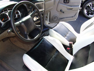 STOCK WITH ALUMINUM GUAGES AND A LOT OF CARBON FIBER PIECES IN PRODUCTION. full suede headliner dash seat inserts and box recovered in suede. honda civic seats with headrest removed in white leather and black suede