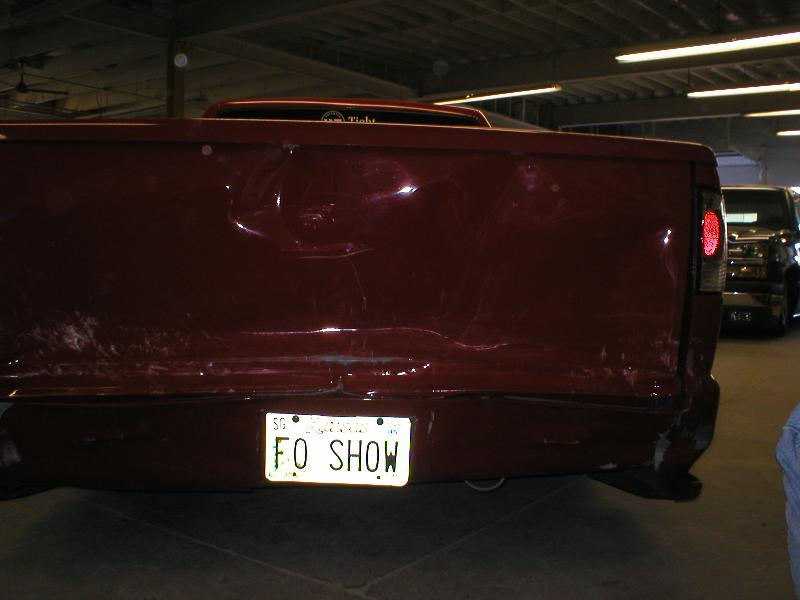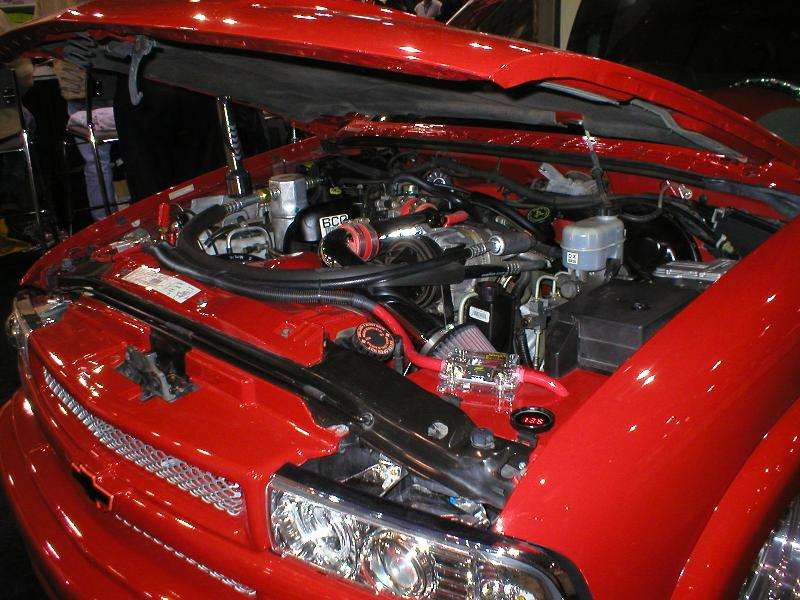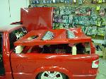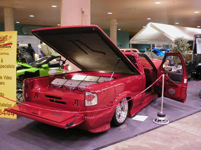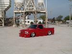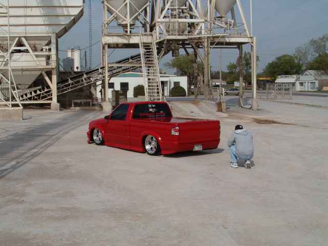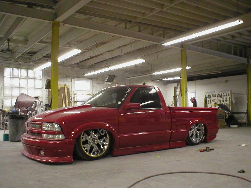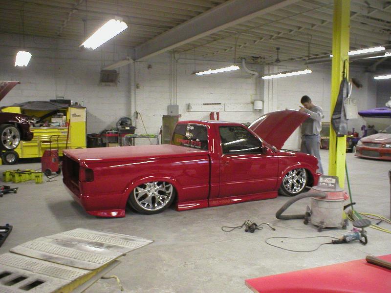 All Stock Red.. Shaved Third Brake Light.. Shaved Tailgate Handle.. Street Scene Mirrors and Wiper Cowl.. Goodmark 2.5" Cowl Induction Hood..