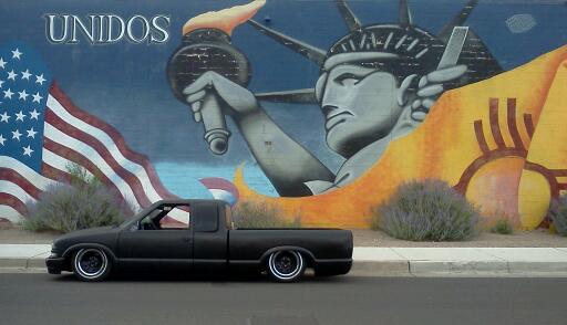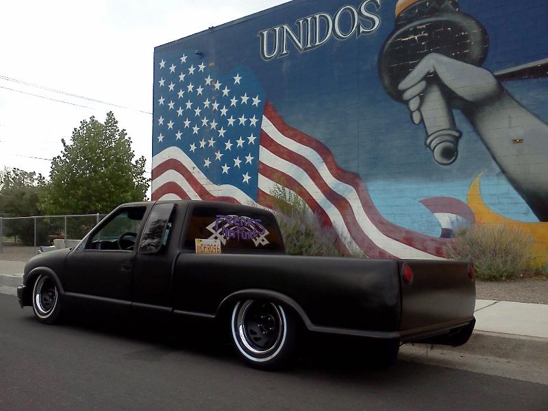 CUSTOM BULIT 4LINK USING 2" SOLID ROUND TUBING W/ ENERGY SUSPENSION BUSHINGS AND SUPER PIVOT BUSHINGS. SD.COM GEN2 NOTCH - CUT AND CUSTOMIZED TO USE THE SD.COM S10 DIFFERENTIAL BRACKET AND LAY FRAME ON DUBS. IM FLOATING ON 2600LBS CONITECHS ALL FOUR CORNERS. 1/2"GC VALVES FOR LIFT, 3/8" FOR DUMP. PUMPED VIAIR 450'S INTO A 5GAL CHROME TANK AND RUNNING 1/2" LINE.