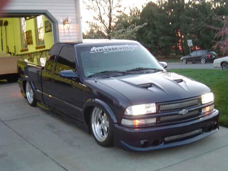 Stillen Front Airdam W/ 4 Fog Lights; Clear Corner Lenses; Street Scene Brushed Aluminum Speed Grills; Billet Chevrolet Bowtie; Cervinis Ram Air Hood; Trenz Billet Antenna; Street Scene Super Sport Mirrors; Smoothed and Body-Color Painted Door Handles and wiper cowl; Clear Third Brake Light; Gaylords Hard Tonneau Cover; Wade Bed Caps; Bed Rug Carpet Bedliner; Shaved Tailgate W/ Belltech Handle Relocation Kit; Shaved Taillights; Custom Molded Roll Pan With Toyota Supra Taillights