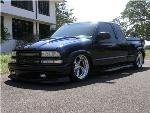Goodmark cowl hood, street scene grille inserts, ss bowtie, APC headlight & diamond corners, 6" billet antenna, Street Scene signal mirrors, tribal flame tint, fiberglass tonneau cover, APC smoked taillights & 3rd brake light, Eastcoast customs xtreme rollpan & step shavers, gibson cat back exhaust, Sir Michaels shaved tailgate handle relocator, Herculiner bedliner.