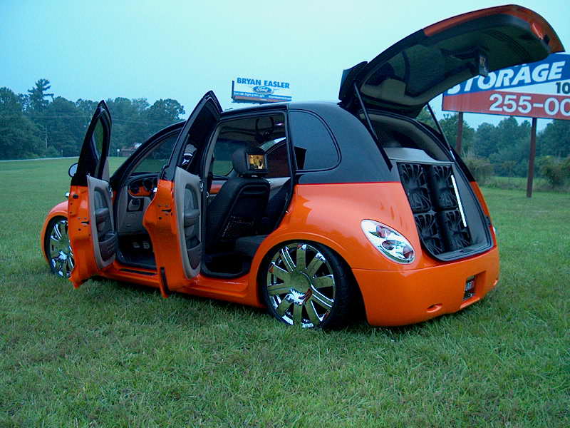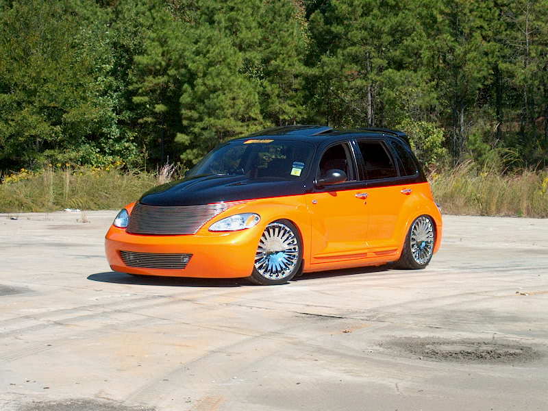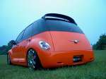 cowl hood,smooth rear and front bumpers, bilt wrap around grill and insert, wing, side marker lights, euro tails, all blue bulbs, House of Kolor black and Tangelo two tone paint, pin strip ,billet ant.polished cruiser emb. on hatch