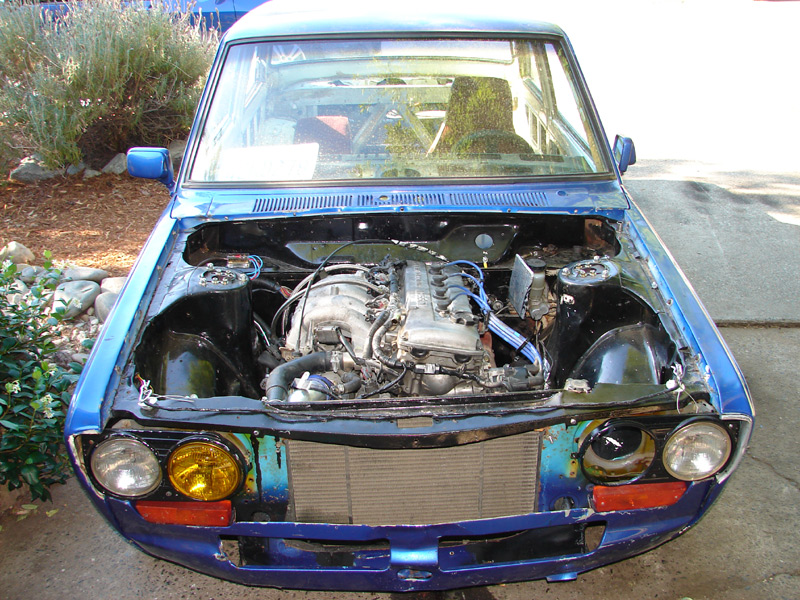 KA-24DE out of a '96 240sx- 2.4L, fuel injected. Tubular stainless header, cold air intake, de-smogged, removed a/c and power steering. 2.5" exhaust out to canister muffler. 5 speed trans., Walbro 255lph fuel pump, braided stainless line for feed and return.