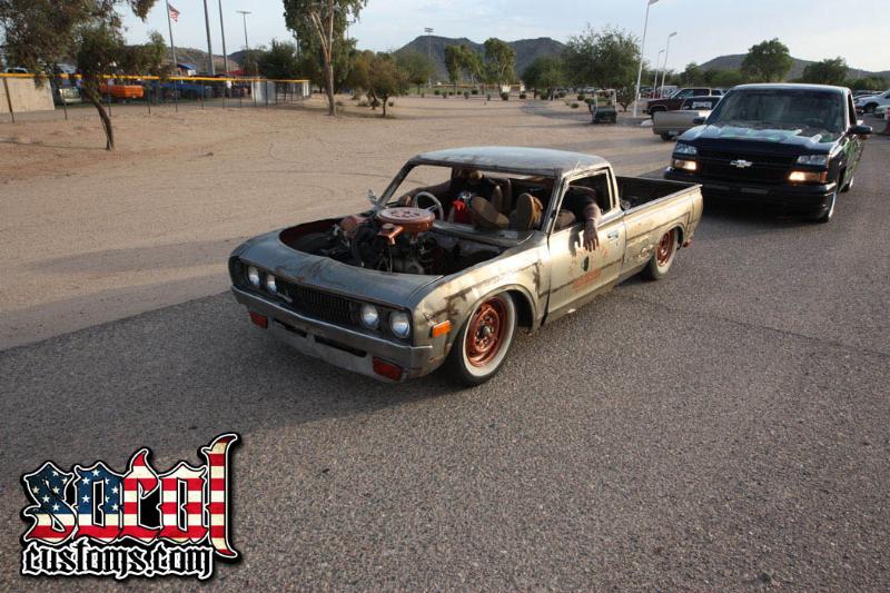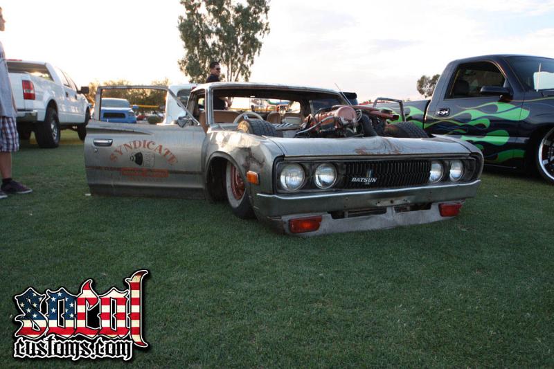 crazy cantilever front with bags in cab, nissan 280z rear end, slam RE'7s all the way around. cantilever rear shocks.