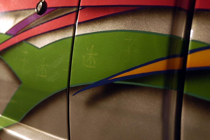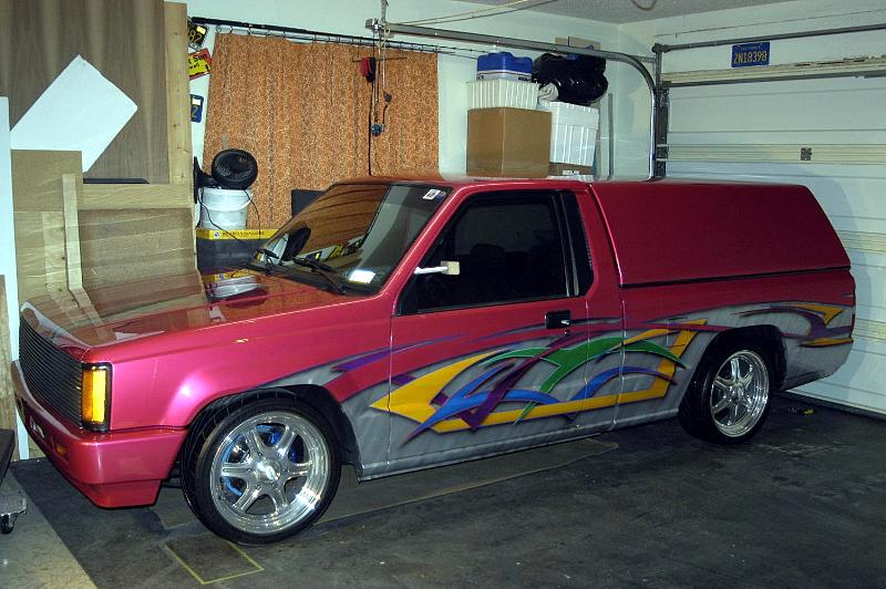 HOK pink pearl, with Tribal graphics, shaved bumper, antenna, tailgate handle, windshield squirters, phantom grille, slab side shell w/walkthrough, Sir Michaels Roll pan,
