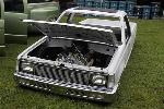 white primer with migthy max front end, billet insert in grille and bumper, shaved doorhandles and locks, cal combo, taillight fillers, and caddy lights, mirrors shaved and finally body droped 3 3/4" lays flat rockers, full 6" flatfloored sheetmetal bed shaved gas door and bed seams, suicide doors, and black rag top
