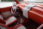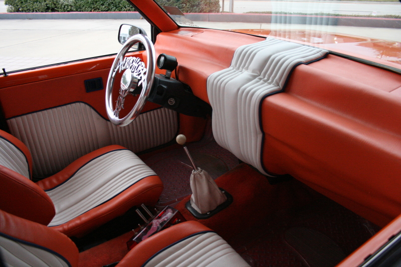 '55 mercury monterey dash, restitched delsol seats, hugger orange ACC carpet, orange/white marine vinyl w/ dixie blue piping for accent, rolled pleats on the dash, door panels, seats, headliner, speaker boxes, and floor mats. relocated stereo head unit.early 50s chevy window cranks. sandblasted windows and one off cut tint job, one-off acrophobia steering wheel courtesy of kustom creations