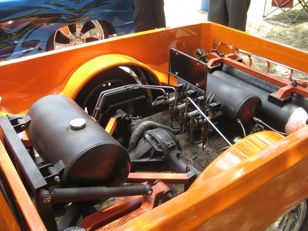 fast bagged, mechanical advantage (true cantilever) triangulated 4-link setup (one- off), 2 nitrogen bottles,custom hardline, conti techs in the front, slam bags in the rear, 1/2" extreme/GC 450 valves, everything built from scratch,painted frame and suspension, lots of fun stuff.