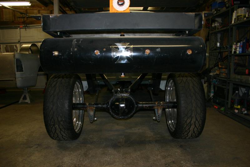2600 Firestone bags, Pete & Jakes 4 link, 12 gallon tank, 3.5" "stock floor" body drop and a little channeling for some extra drop, no pinch-lays hard rocker, Ford 9 inch rearend shortend by Moser with Wilwood disk brakes.All work performed by myself and Insane Kustomz, Paris Tn.