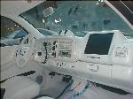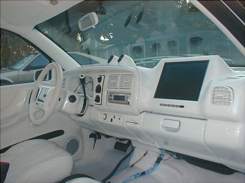 painted dash, with 11.?" tv fiberglassed in passenger side. TV fiberglassed in stearing wheel. All white interior includeing the stearing wheel and carpet. 92-95 honda civic buckets with chopped headrests, white gauges, Two white gages fiberglassed on the dash. ps2