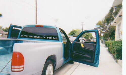 CUSTOM SUB-BOX FIBERGLASSED THROUGH THE BED INTO CAB/ FOSGATE HX2 12"/CALIFORNIA 8OO AMP/INFINITY IN THE DOORS & BACK PANELS/TWEETERS IN THE TOP CORNERS OF WINDSHILD ETC.