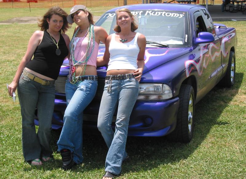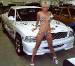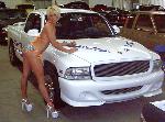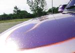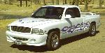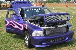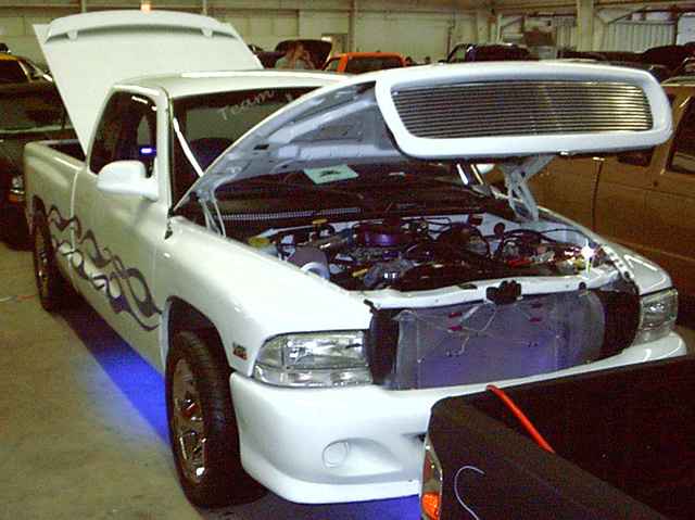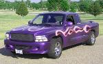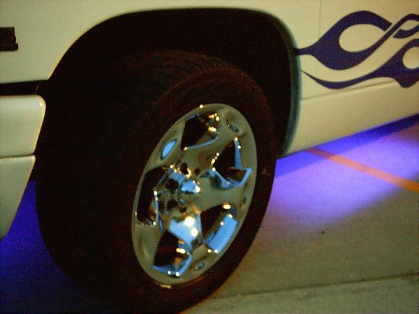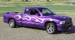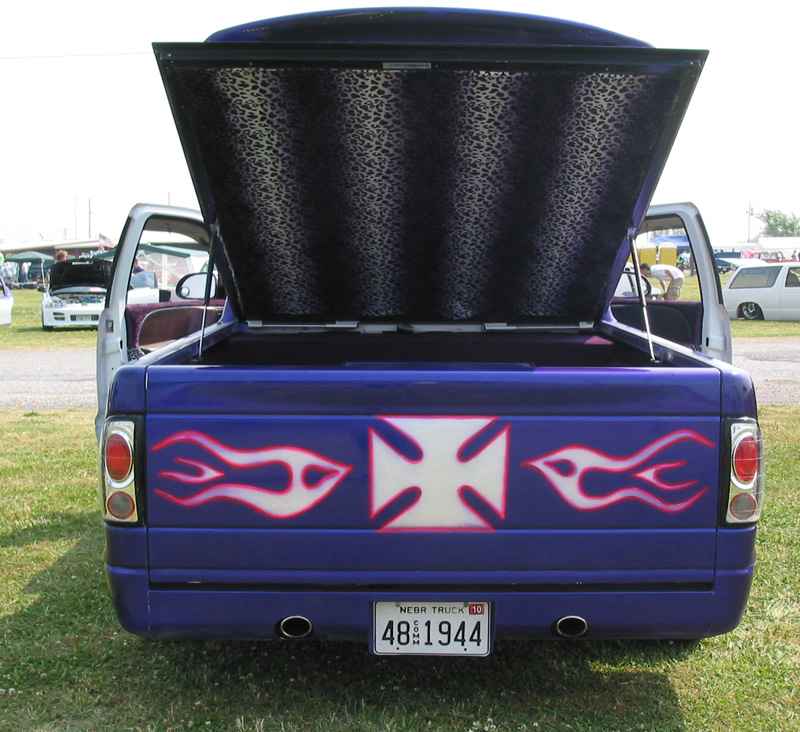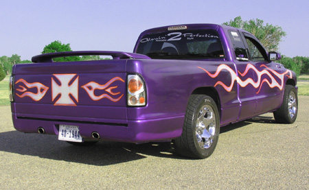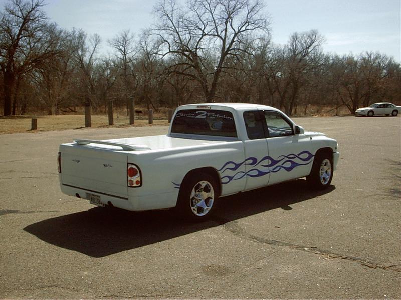 Purple flame graphics (vinyl) on factory white paint, custom roll pan with dual exhaust, Checkmate tonneau cover, clear corners, euro tails, billet antenna, neon underbody lights, shaved handles, phantom grille, bumper cover, Mustang spoiler on tonneau cover to allow me to open the darn thing....