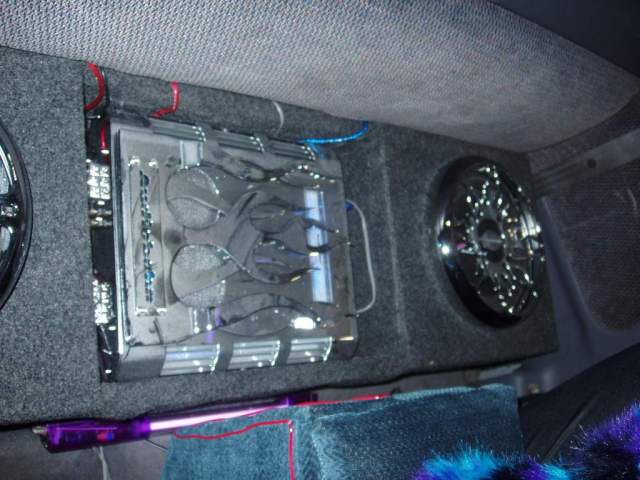 Sony head unit, factory speakers, Audiobahn amp and two 10" subs in custom box I built way too small, soon to be replaced by bigger box with Memphis amp.