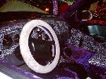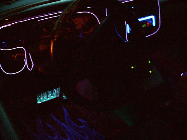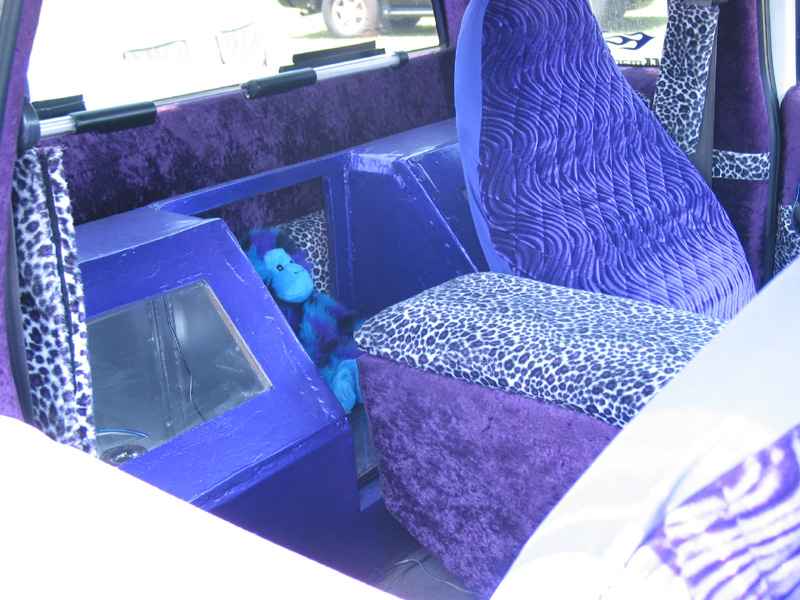 Purple crushed velvet and purple snow leopard interior, custom center console, and a BUNCH of neon.