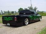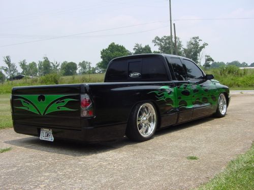 Removed factory fender flares. Shaved: all handles, third brake light, all emblems, gas door. Alter Images rollpan, molded in. Organic Green HOK flames w/ silver outline. Suncoast creations ram air hood, K&N filter. Stull billet grill w/ fiberglass shell molded into hood. Clear corners, carbon fiber euro tails. Streetscene mirrors, custom wheel tubs and, fuel door in bed.