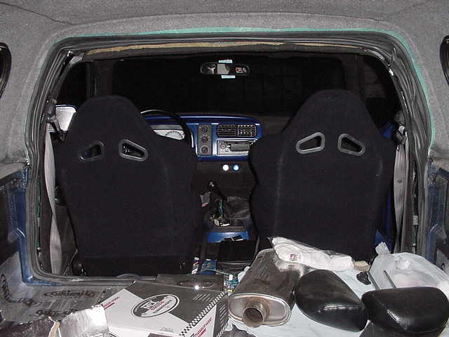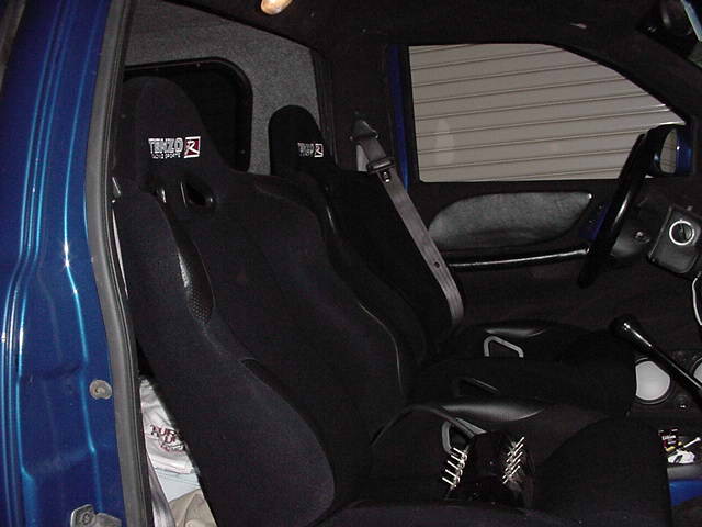 Black Tweed on Dash, door panels, headliner. Tribal Flame graphics in headliner and on door panels. 1 set of Tenzo-R racing seats. Complete Walkthrough with 2 Civic seats going in bed facing forward.
