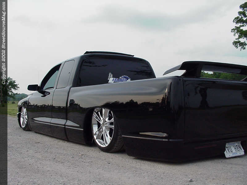 STOCK FLOOR BODY-DROP!shaved handles, antenna, 3rd brake light, emblems, gas door, tailgate handle, taillights and molded in rollpan w/ LED 's. double scoop ram-air hood. Corvette rear wing mounted on checkmate bed cover. custom painted onyx black. clear corners. Personalized license plate - YRUH8N. 32"x38" eletric sliding rag.