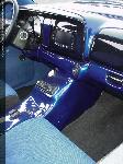 custom fiberglass dash and console painted royal blue metallic and onyx black. tv molded into dash and cd player moved to console. air vents and interior door handles shaved. seates, door panels and wall are lake blue and black tweed. White face gauges.