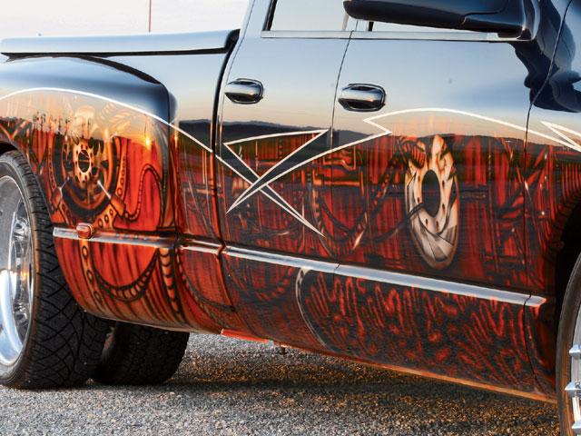 An X Klusive grille,K and S Kustom sprayed and coated the big-wheel hauler with a House of Kolor Bright Silver, Rootbeer, Tangerine, and black paint scheme and airbrushing.