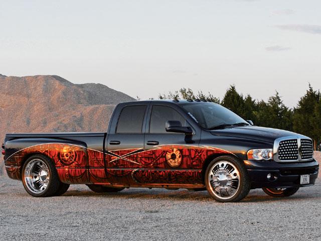 factory 5.9L 325hp Cummins turbodiesel adorned with accessories coated in House of Kolor paint. A 4-inch Flowmaster exhaust system complements the factory turbo, which features enlarged piping and runs 12 to 16 pounds of boost.