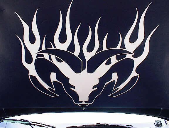 factory v-8 with blue wire loom and rams head w/flames under the hood