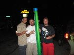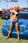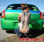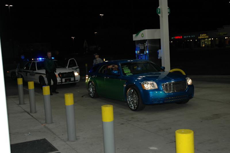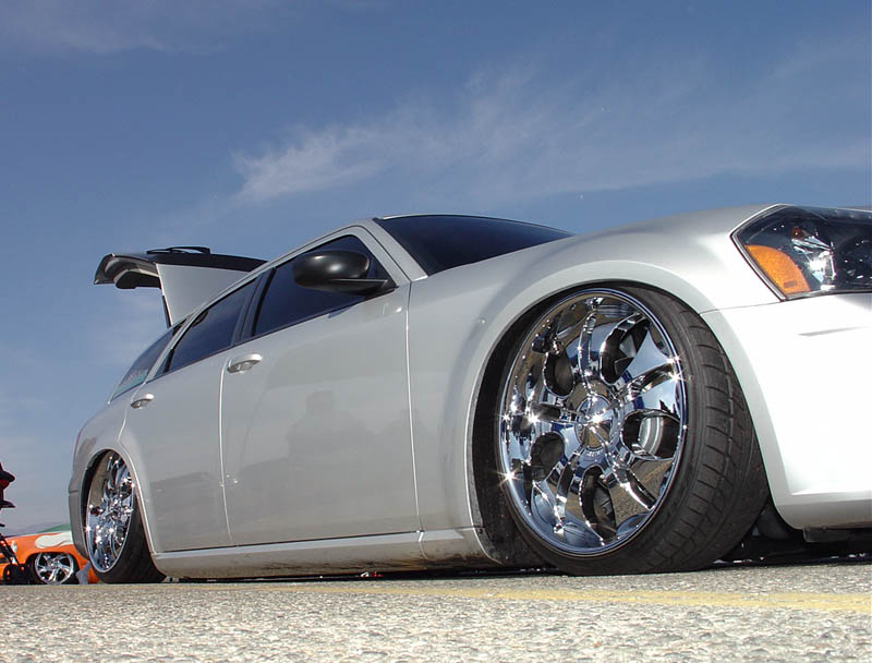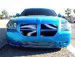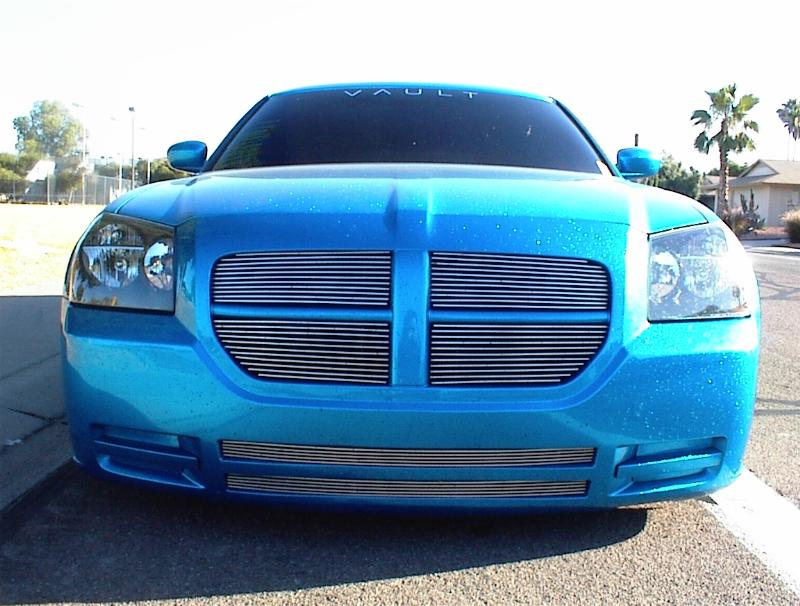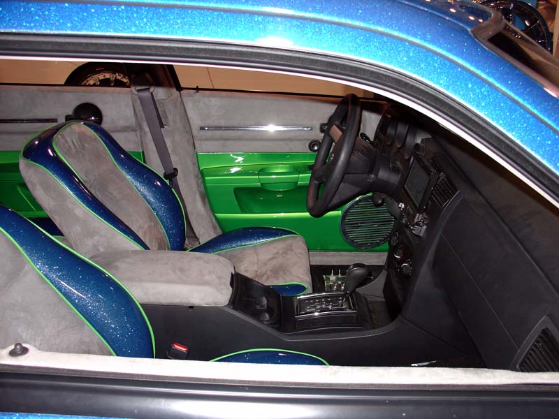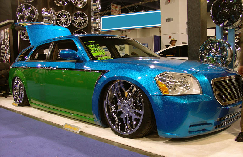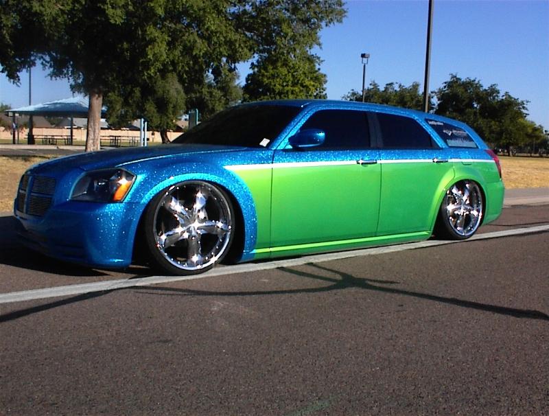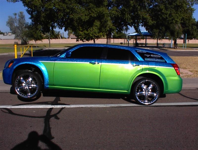 SOLD...Shaved front and rear bumper lines, front emblem, hood squirters, rear wiper, rear tailgate handle. Color changed to royal blue flake and lime time green, billet upper and lower grill, chrome divider ....Paint and body work done by John Owens. 300c chrome door handles all rear no locks. Grunions fabrication cut the car to lay flat