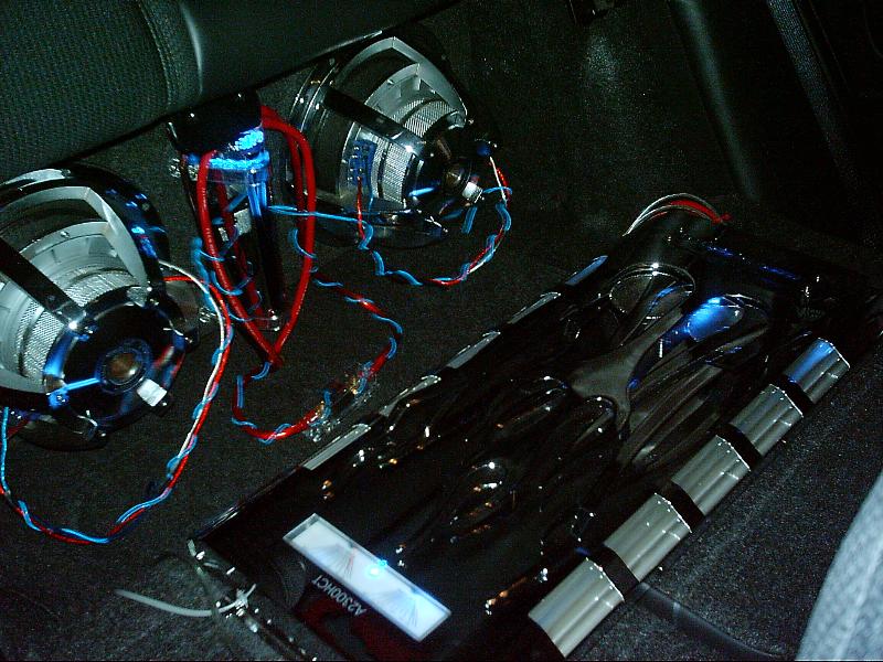 2 12" Audiobahn 1200Q excursion subwoofers, Audiobahn 2300HCT Amplifier, pioneer door & rear speakers, 2 farad tsunami cap, 100A fuse, 4 gauge wire to amp and cap & 12G wire to subs. blue string light wrapped around 12Ga sub wire. blue led strobe lights aimed at subs