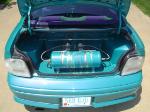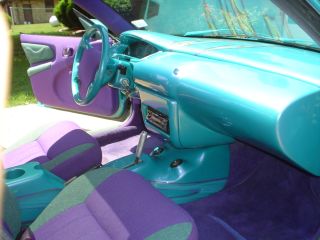 Green and Purple tweed with tribal flame inserts on the doors. Custom fiberglassed dash,center console and trunk.