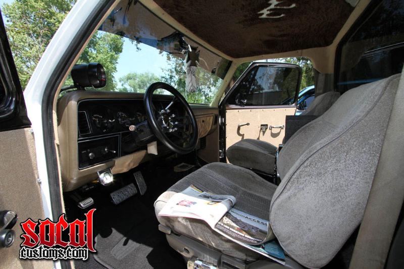 Paint and body was done by Brandon Sisco of Sisco's Customs in Visalia, California, powdercoated Fabtech light bar, three KC Daylighters, everything underneath powder coated by Visalia Powder coating of Visalia California.Cen Cal Distributing onboard air system w/ 5-gallon nine-port air tank, 280C Viair compressor, United Pacific train horn with manual release valve mounted inside of cab