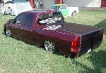 SHAVED EMBLEMS, SHAVED SIDE MOLDING, SHAVED TAILGATE HANDLE,SHAVED CAB EMBLEM, MOLDED IN ROLL PAN, BILLET GRILL, BILLET LICENSE PLATE FRAME, BILLET ANTENNA, 1% TINT VERY DARK AND VERY ILLEGAL,HID FOG LIGHTS VERY COOL WHEN THEY ARE 3 INCHES OFF THE GROUND DRIVING DOWN THE ROAD LOL, PAINTED THE TRUCK 2 COLORS MERCEDES VIOLET OFF CENTER A LITTLE ON THE PASSENGER SIDE AND BURGANDY STILL ON THE DRIVERS SIDE WITH SILVER FLAMES DOWN THE WHOLE TRUCK TO DEVIDE THE 2 COLORS, FLUSH MOUNT BED COVER ,FULL BED KIT IN VINYL WITH GRAPHICS BY MOONLIGHT CUSTOMS WILL UPDATE PICS SOON