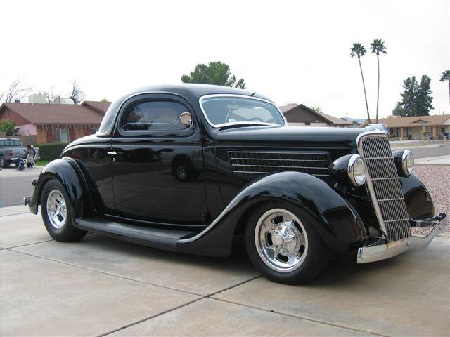 Top / 2.5” chop, with 48 Ford Coupe top used to fill in, by M. Roads Horns / Spare-tire removed, Bitchin Products firewall and floor-pan, PPG Concept DCC 9000 Black, 35’ Ford taillights modified