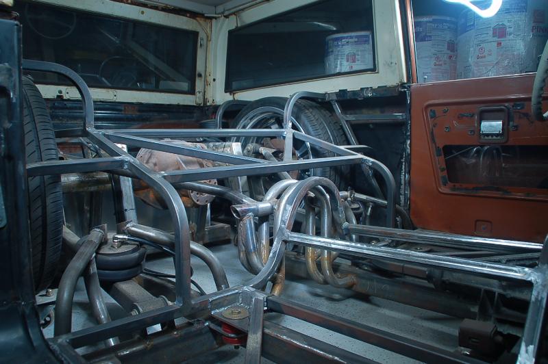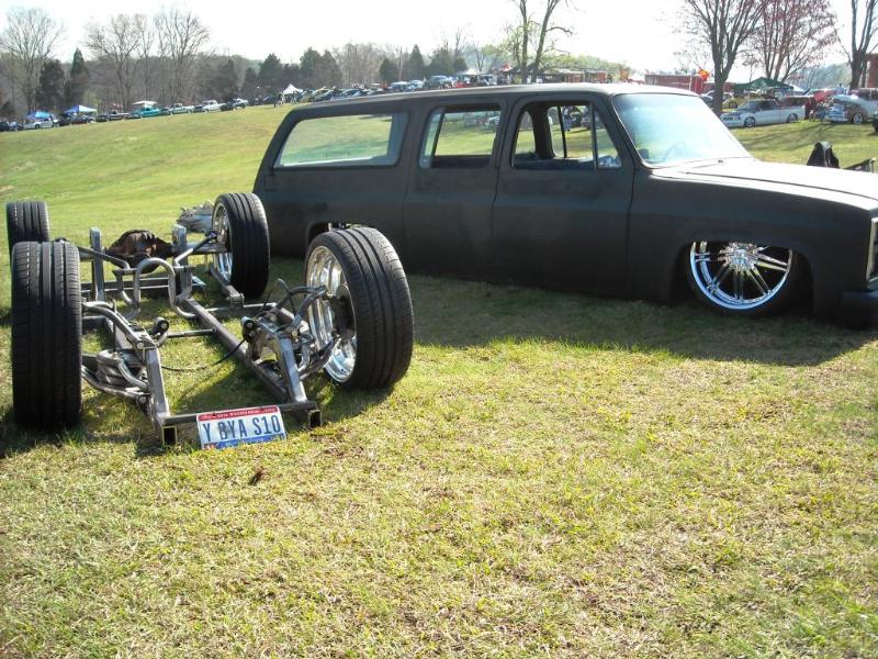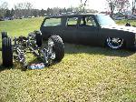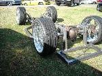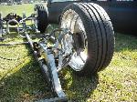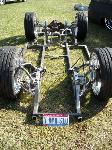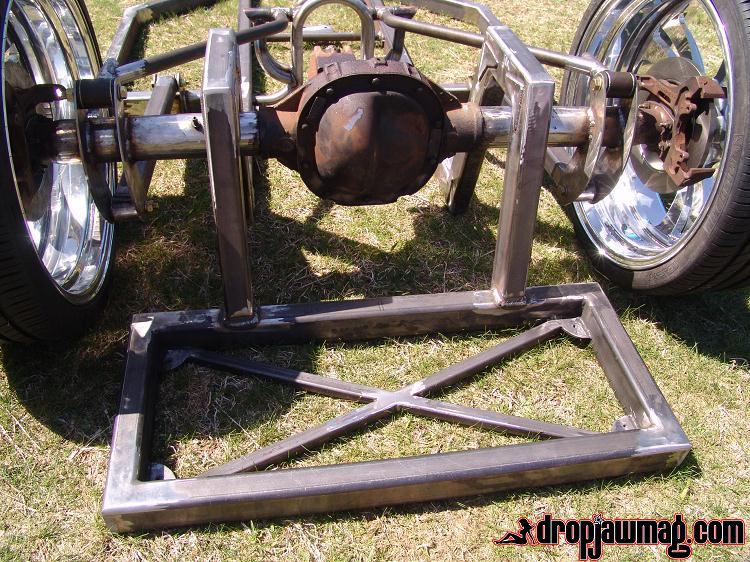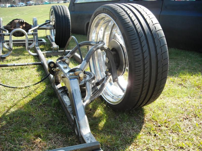 full chassis made by myself, uniballs in front, custom made control arms, suspension design done in autocad, 1 1/4" DOM 3/16 wall tubing used throughout. Rest of chassis is 2x3 3/16 wall, triangulated fourlink, 8.8 4.10 explorer rear end, toyota 2" drop spindles reamed and sleeved for bolt instead of ball joint, mustang II rack and pinion