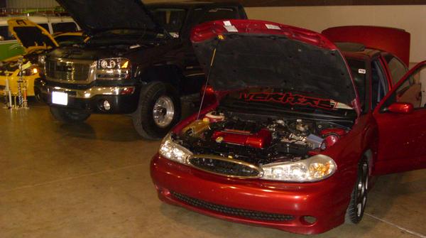 2.5L Duratec SVT. VM TB inlet, VM Short Ram Intake, Color Matched Engine Cover, Painted Radiator Sub-frame, Color Matched Fuse Box Top, Polished A/C Lines, Polished MAF sensor, 22" glasspack w/ 2.5" Dual exhaust w/ Powetone Tips.
