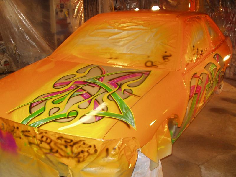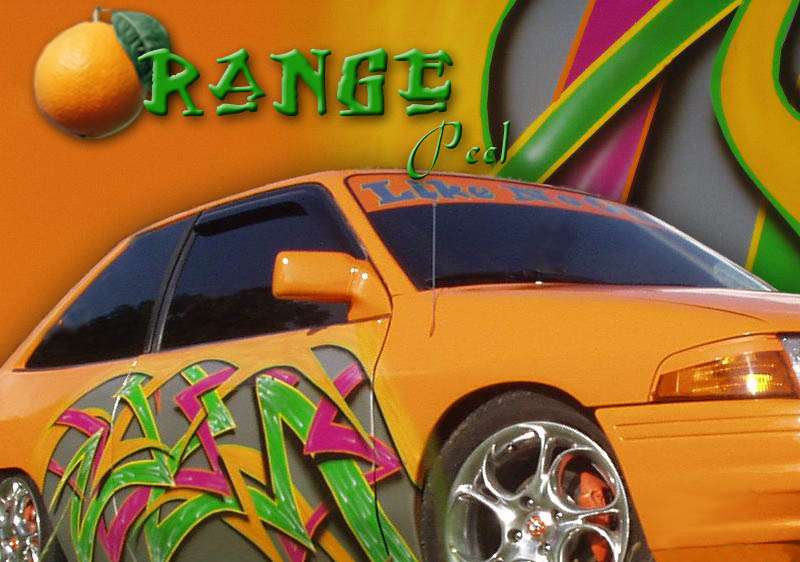 Shaved tail lights, door handles, antenna, body line. Double row l.e.d tail lights, frenched in license plate box, frenched in antenna on passenger fender, and smothed out rear of the car. Orange painted with graphics painted on the side and hood.