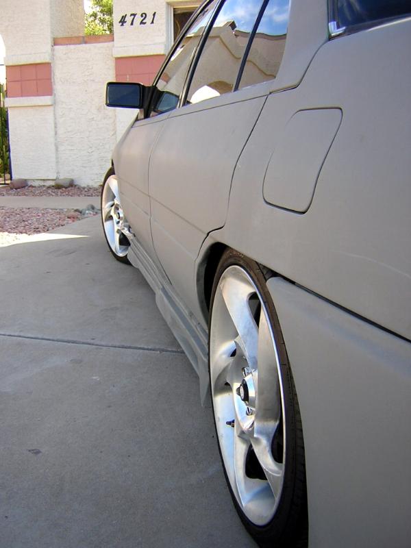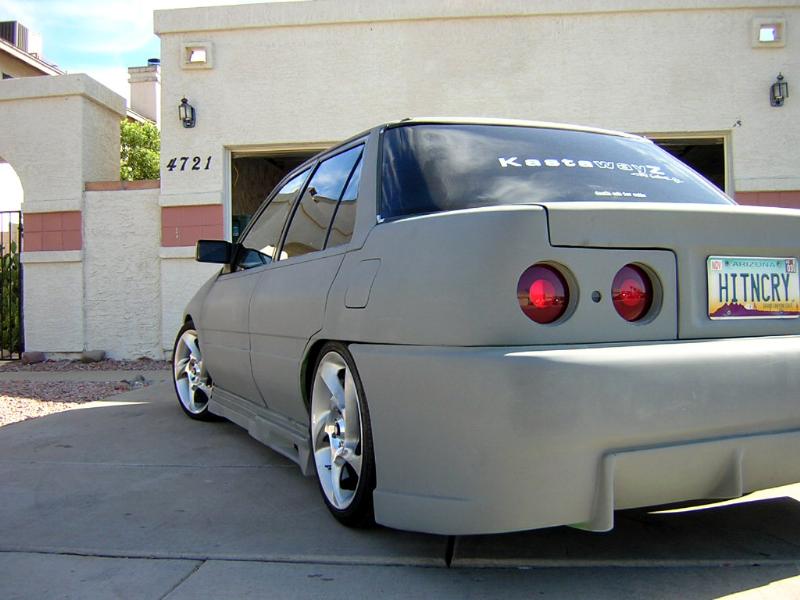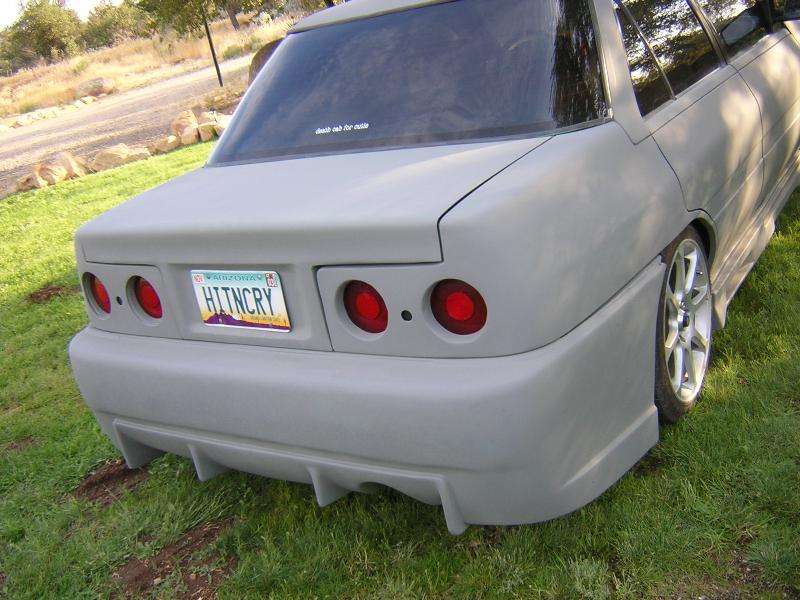 Shaved handels, Custom fitted bodykit, clear corners, green(now grey) primer. frenched R32 skyline Taillights. started 04' silverado headlight conversion.