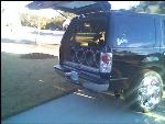 AlpineCVA 1006 6.5 head unit , 4 12" w3 D6 SUBs in a custom box, MB Quarts mids & highs( F ) , MB Quarts mids ( R )Lanzar tweeters front door and rear doors , Rock Fosgate amps and caps under the seats( 2100 watts )Plye 5.4's screens in head rest ,10.5 center ceiling of suv( four screens running off a Alpine DVD player mounted in a custom design