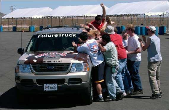 Lincoln LS 3.0 V6 coupled with 5R55 Automatic Transmission. coupled between the Engine and the transmission is a 21.6 kW (10 kW continuous) Honda insight radial flux motor. The engine has a 13:1 compression ratio, with 28% increase in fuel injection. The electric motor eliminates the need for a starter and provides with "engine off at idle" capability.