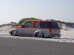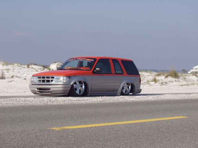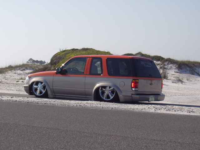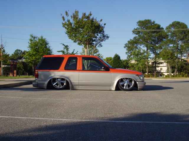 4" stock floor body drop, custom made triangleated 4-link, gets 16"s of lift in the rear. Shaved firewall, Airlift air commander engine driven air compressor, 1/2" valves, fabricated new engine mounts so the engine doesn't look gay stickin' out through the hood, fabricated front frame clip and bag mounts, new tranny cross member and fabricated rear floorboard, rear end shortend 3" and tubbed out. Fabricated aluminum gas tank, battery relocated to the rear, new exhaust system, etc. etc. etc. layin body with 20's all the way around. I am pretty sure it is/was the first 2 door Explorer stock floored on 20's. Completed Fall of 2003.