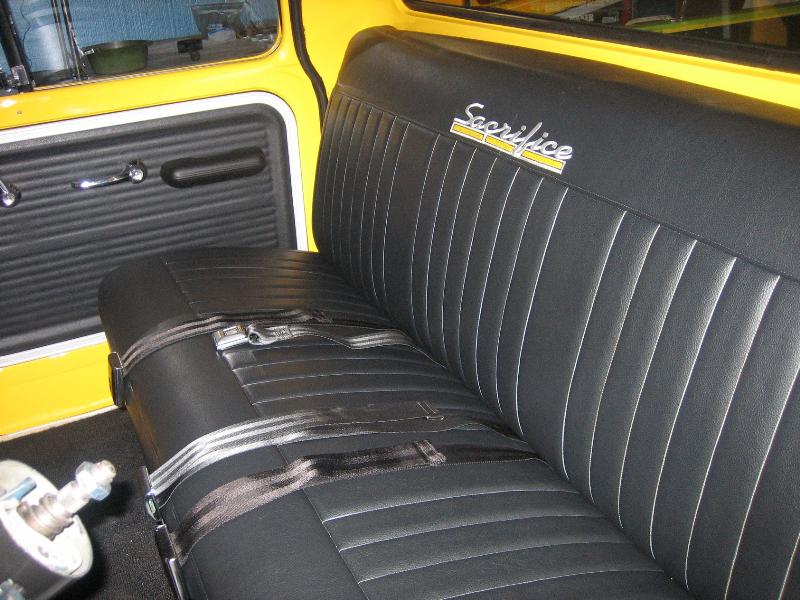 Recovered bench seat, shaved steel dash, Upholstered door panels and headliner, custom Haneline gauge panel with autometer Phantom gauges