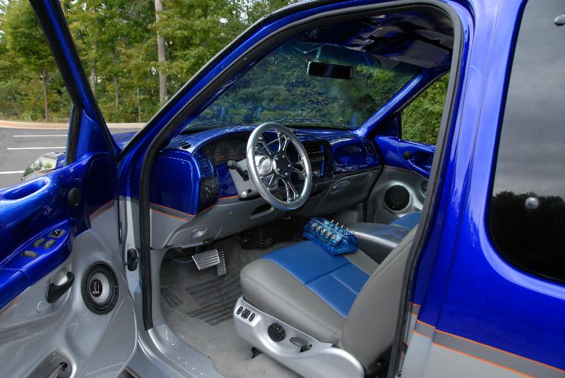 Has super cold A/C! Smoothed and painted all interior panels including the doors and the dash. Same style of paint runs into the inside. Custom center console that comes off of the system box. Charcoal leather with blue leather inserts on the two captain's chairs - real leather not vinyl or bonded leather. System has 3 Audiobahn AWT10X subs powered by an Orion 2500d amp. Also have a set of MB Quarts 5.25" components fiberglassed into the doors. Full fiberglass headliner with fiberglassed visors completely sprayed in the cobalt candy blue. Back and rear windows tinted 2%. Front windows are no longer tinted due to IL state law.