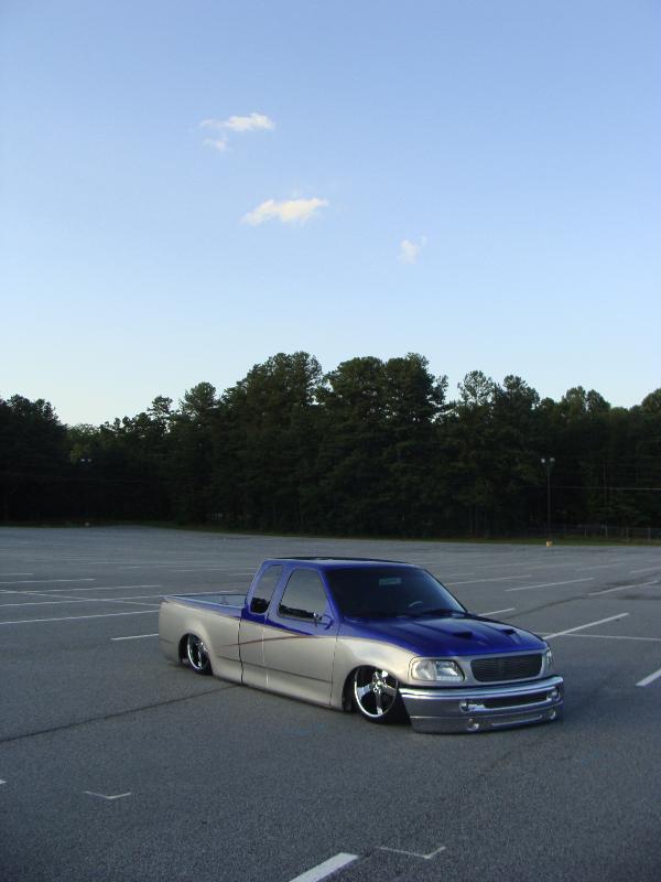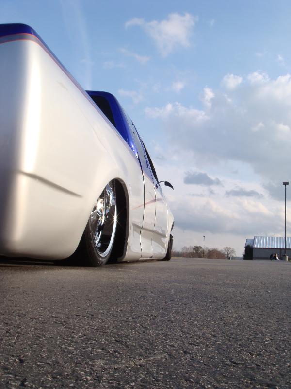stock floored with 2X4, chromed djm upper and lower control arms, chromed belltech drop spindles, 3-link with a watts link in the rear, re-7s up front, 2600s in the back, 1/2" chrome asco ups, 3/8" chrome asco downs, all 1/2" copper plumbing, 4 viair 480s on 7 gallons, over bodydropped bedfloor, shocks on all 4 corners ~2.5" narrowed off the rear end on each side.