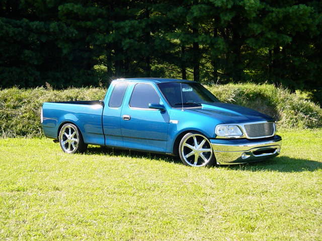 lightning headlights, cervinis cowl hood, euro clear corners, acetoned emblems, roll pan, shaved tailgate handel and ford embelem and f150 embelem on tailgate, all clear tail lights, chrome anteena base, and billet anteena, trenz billet grill, street scene mirrors, chrome lower valance with driving lights, smooth and painted upper bumper pad smooth bad caps and tailgate cap lightning 3ed brake light bed rug HID headlights