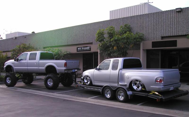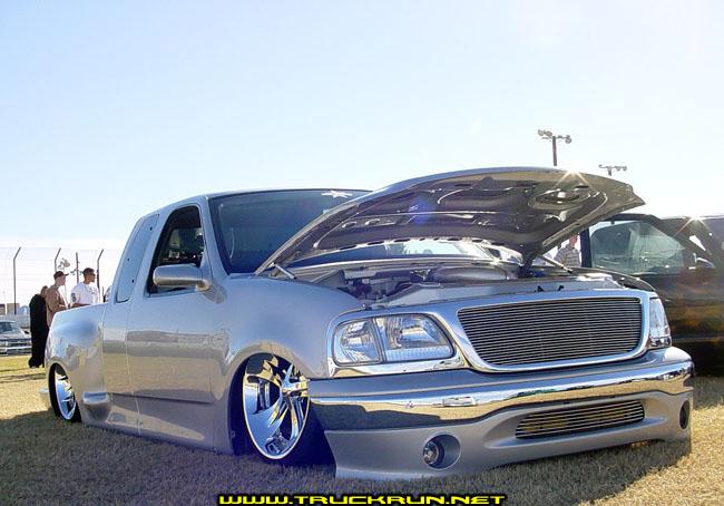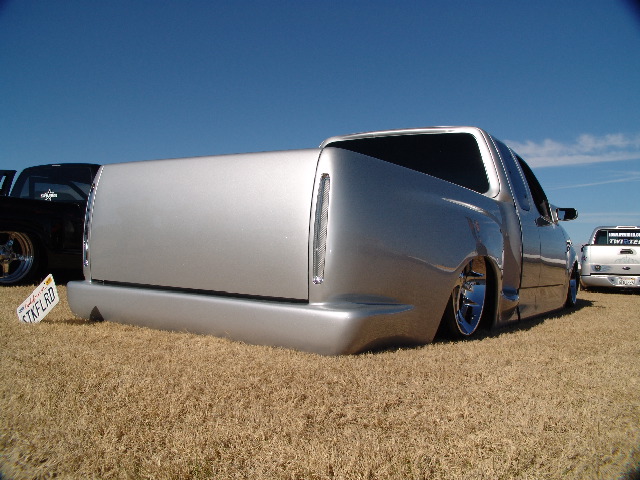 Shaved: Door handles,F150 side logos,Antena,Hood sprayers,compleet wiper crowl,(no wipers) tailgate, thrid break light, gas door tail lights now caddys..custom made roll pan, street scene mirrors, Harly lower valance, billet grills,dimond clear head lights and markers BED: molded every thing, look at the pic... Ect..Ect..Ect..Also one more thing, a 4.5" Stock floor body drop motha fuckaaaaaaa!