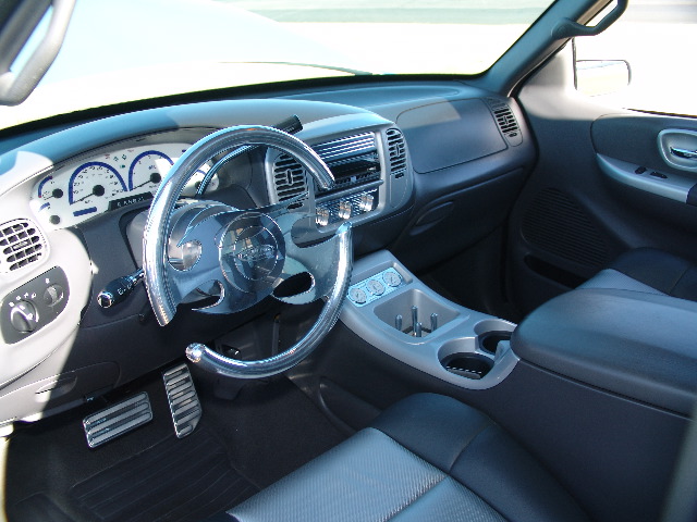 Painted expo center councle with air gauges glassed in to it, painted dash and door pieces, coustom billet parts by billet and acrylic, billet mirror and peddles. harrly davidson shift lever and door handles. apc gauges and I think thats it.
