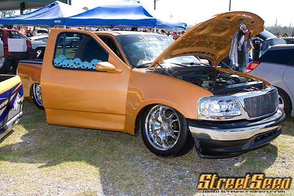 '99 bumper and grill update, shaved, bright orage with green pearl, 20' rims, gas tank box and notch cover sprayed with green bed liner, roll pan, custom tint