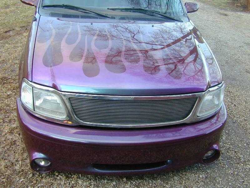 maroon, color change flames front and back, all shaved, grill, front valance, bed cover, tint
